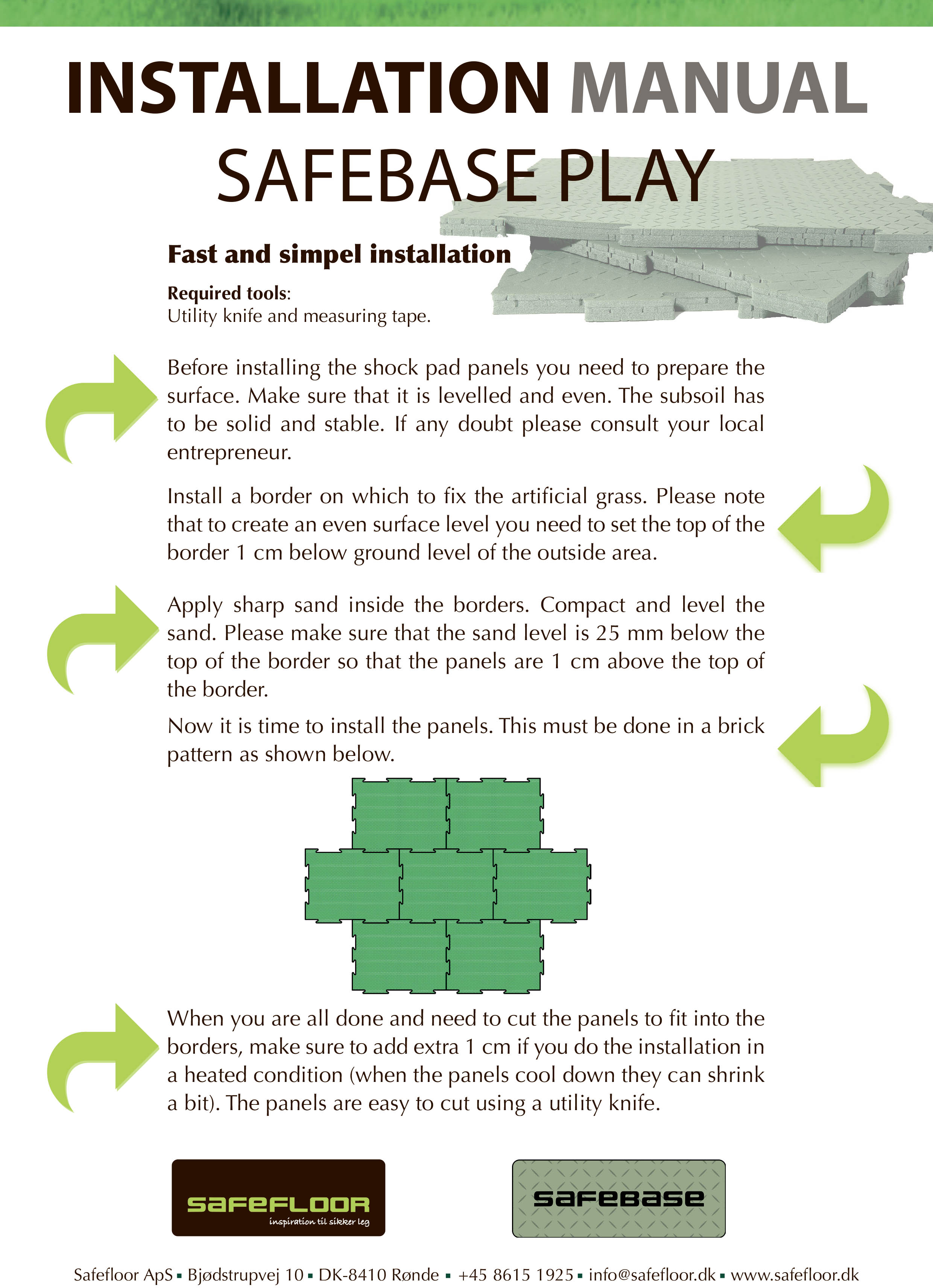 SAFEBASE PLAY is the perfect shock pad for any playground installed with artificial grass. It comes with puzzle edges for fast and easy installation. Size is 76x100 cm (installation size 72,5x96,5 cm), which makes it very easy to install around the playground equipment.